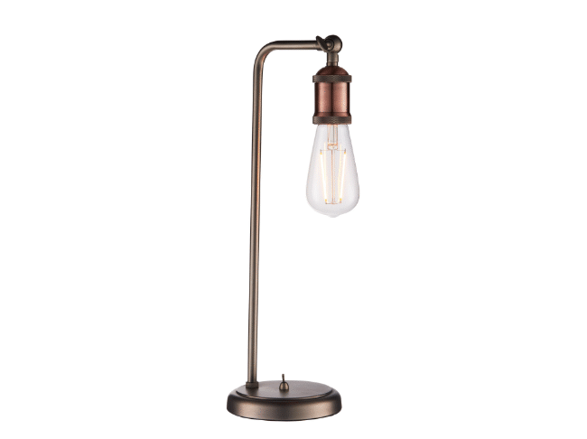 Antique brass finish has been applied to bring warmth and style to this industrial look table light. With adjustable heads and on/off toggle switch. Twin with E27 LED filament for that unique ‘on trend’ look.