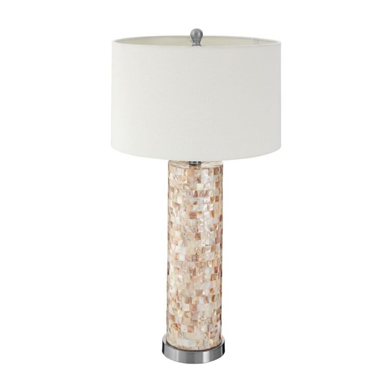 The Herma Small Table Lamp stands on a round plinth made from reflective silver metal which corresponds with the upper stem and finial. A multitude of square shell shapes adorn the cylindrical base, giving this boutique hotel piece tactile appeal. Their colours range from very light to dark sand tones, complementing the cream coloured fabric shade.