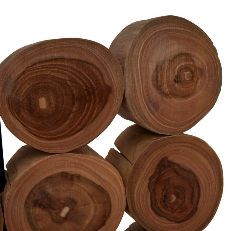Ashwell Table Lamp With Cut Out Wood Base body is formed from cross-sections of teak wood, displaying the growth rings and their distinctive patterns, creating a unique and distinctive accent piece.