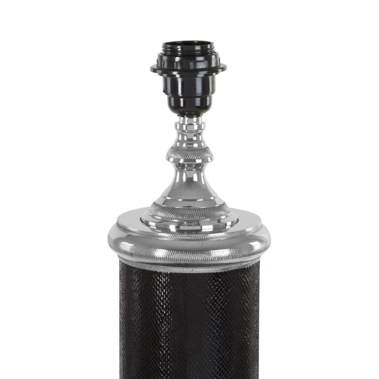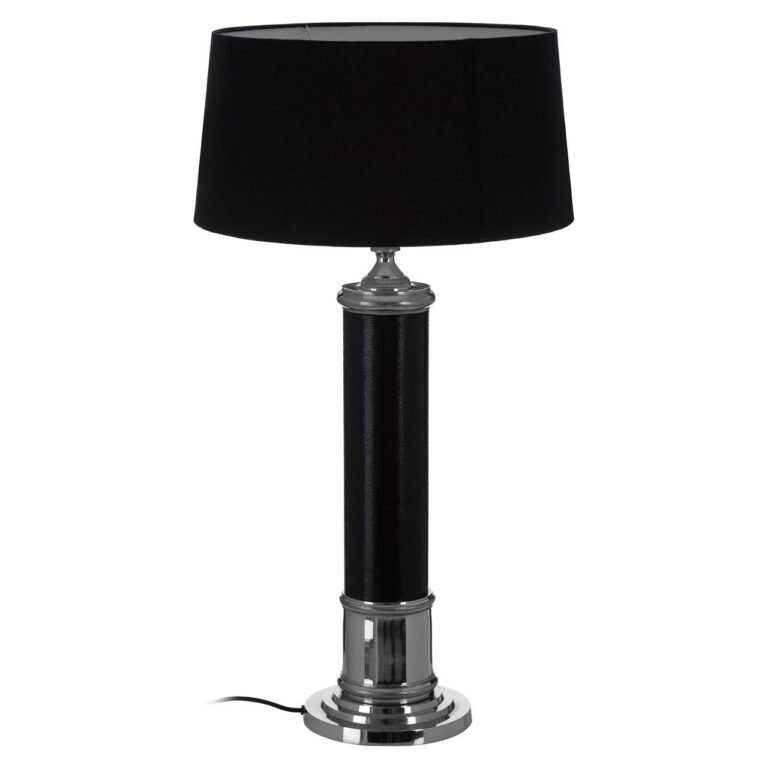 Lanon Table Lamp: The stand of this handsome table lamp is made from metal and is wrapped in tactile black leather. The reflective base is stepped, and features subtle etched detail, with a matching pattern in the stem beneath the shade. *Please note, shade is not included.