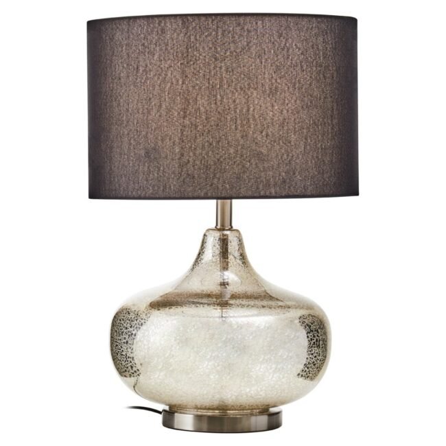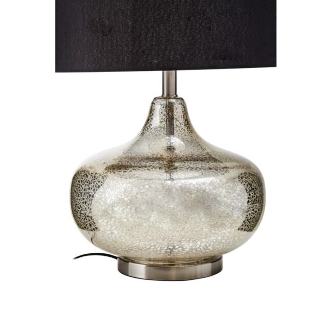 “This table lamp has a round metal plate beneath the glass body that provides stability and coordinates with the metallic silver sheen on the glass. Complementing the base, the black linen shade will help to emit a soft glow in any room.”