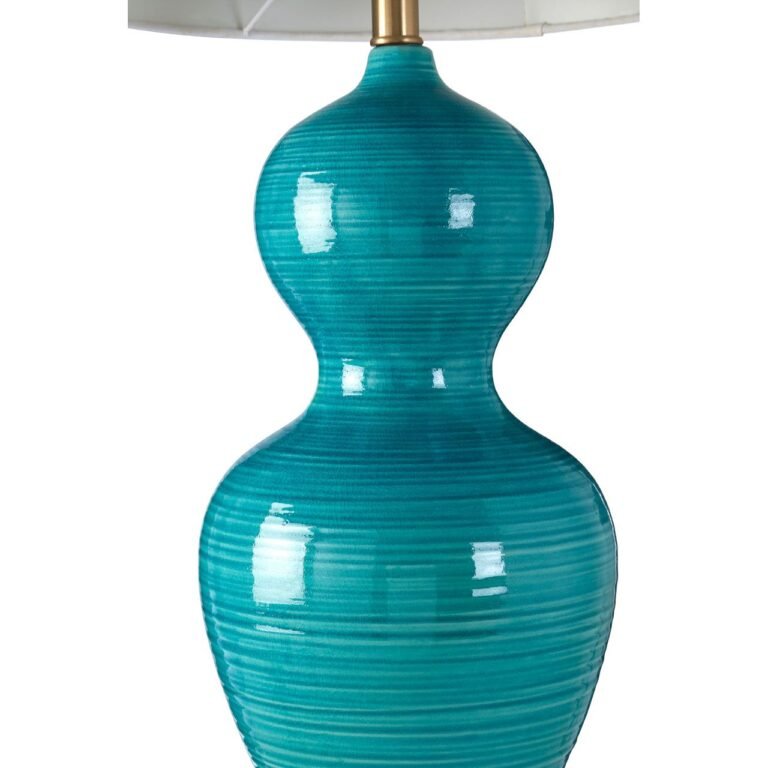This Lyn Table Lamp With Blue Ceramic Base has an elegant aqua blue coloured body featuring a warm metallic iron finish ring base beneath it. The curvaceous body is made from glazed ceramic and has a brushed design that gives it a textured look. The contoured base is topped with a chic white, slightly tapered shade made from soft linen.