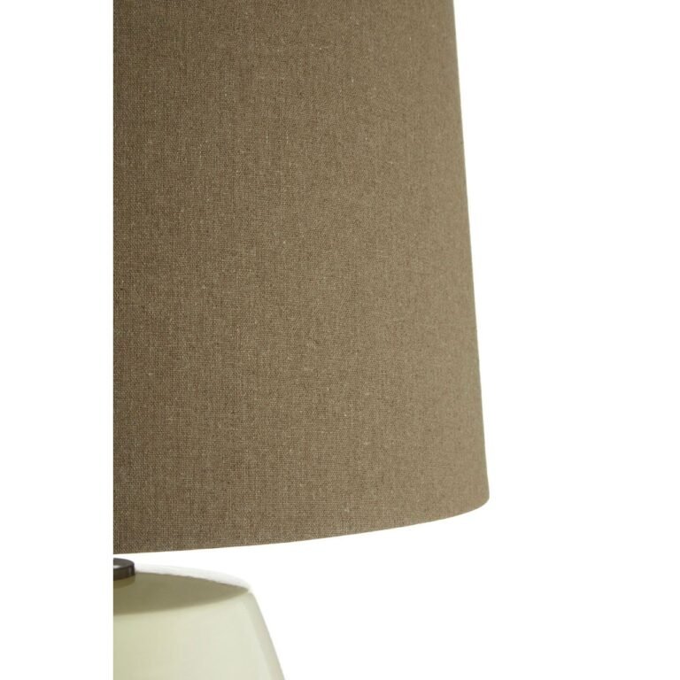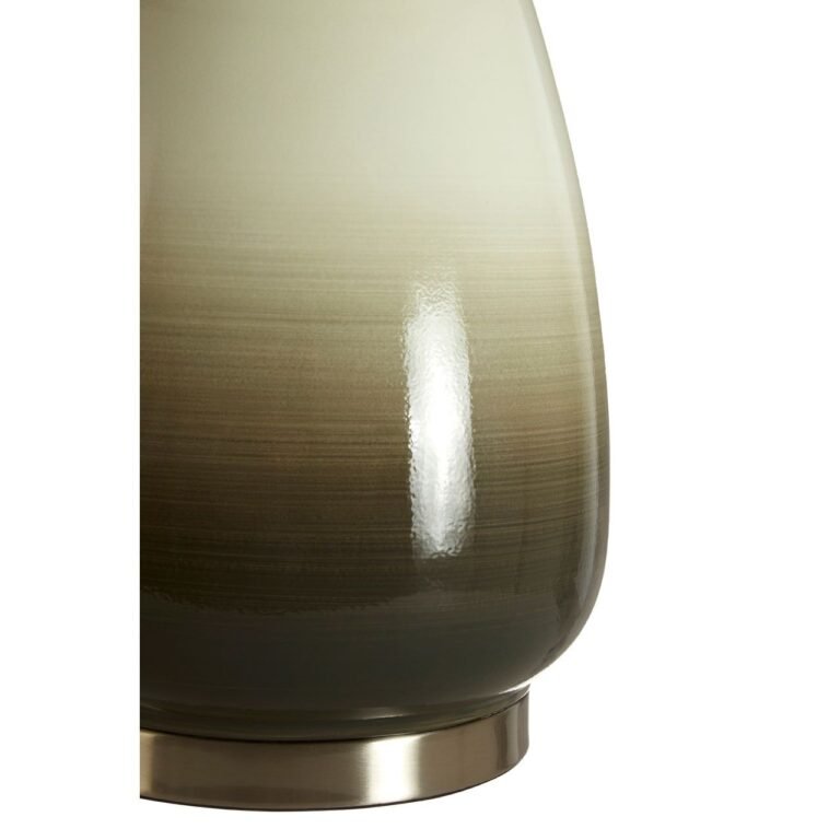 Oinille Table Lamp With Eu Plug: Its body is formed from smooth ceramic which has a glazed finish that accentuates the deep green and milky white colours. The green dissolves into the white, tonal balance being created by the taupe coloured shade. The shade is made from soft linen, while the slim metal base has a chrome finish for a hint of reflection against the otherwise muted palette.