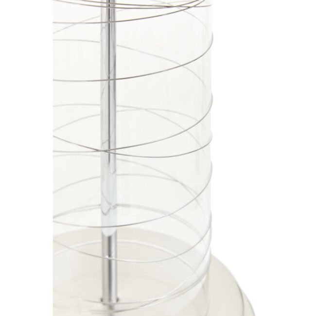 The Orimk table lamp features a cylindrical glass body which is adorned by delicate spiralling chrome and chrome hardware. The intricate base is balanced with a minimalist black linen shade.