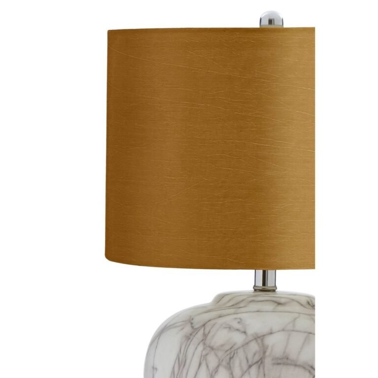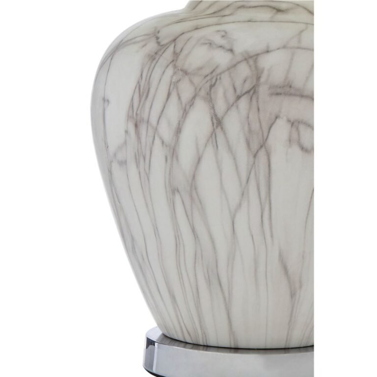 Formed into round tapered shape, this Rael Table Lamp’s ceramic stand is textured with asymmetric lines pattern. A round, silver finish iron base maintains its balance on the tabletop and lends it a minimal metallic accent. The natural fabric shade complements muted tone of the stand and will create a sense of ambiance in the hallway or living room.