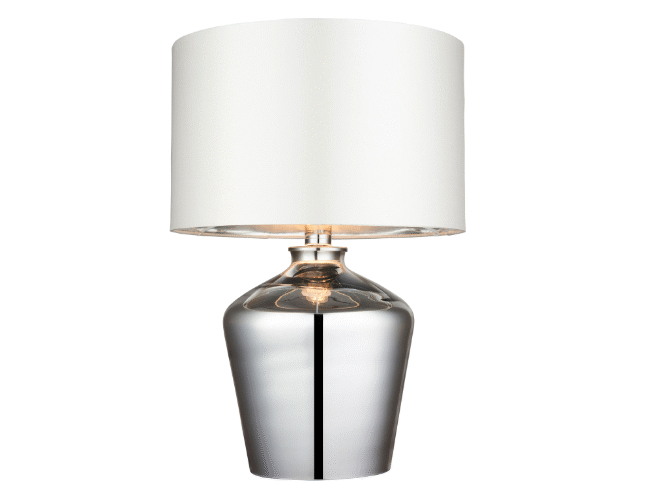 A chic glass table lamp with a high shine chromed glass base with a ivory faux silk shade. Fitted with inline switch. suitable for use with LED lamps