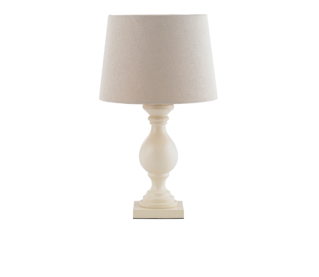A wooden table lamp finished in an ivory paint and complimented by an ivory linen shade. Comes with an inline switch and suitable for use with LED lamps. Also in taupe