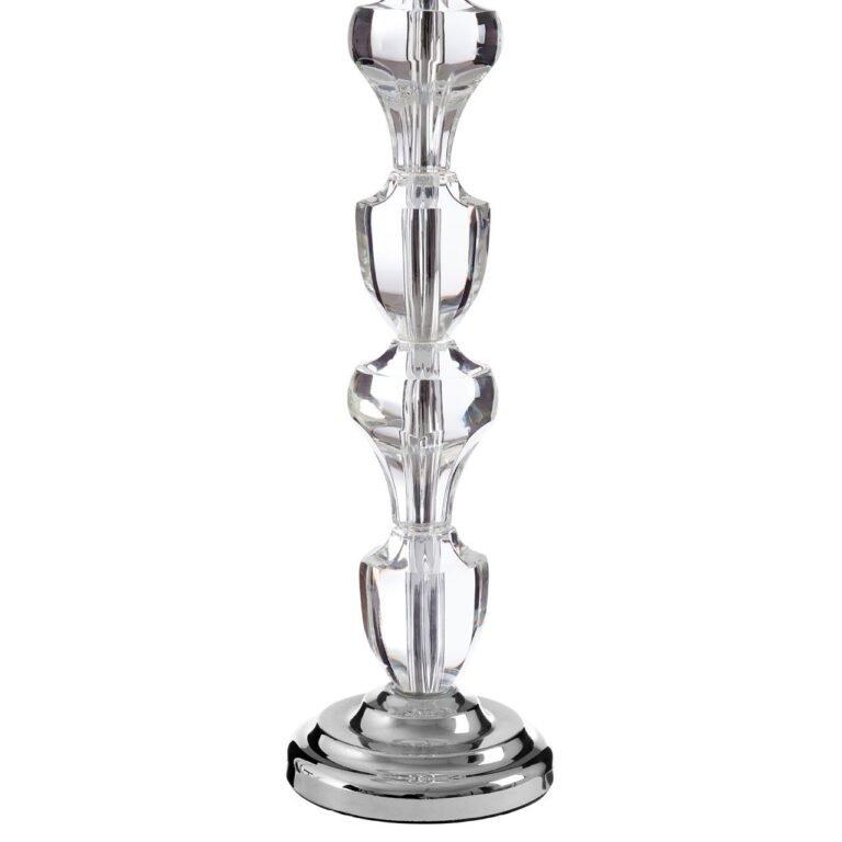 Tarine Table Lamp: This table lamp features a crystal glass stand with a stepped design which enhances its decorative appeal. It is complemented by a chrome finish tiered pedestal which adds a metallic touch to counterpoint transparent hues. A white fabric shade will disperse light gently downwards while creating a radiant ambience.