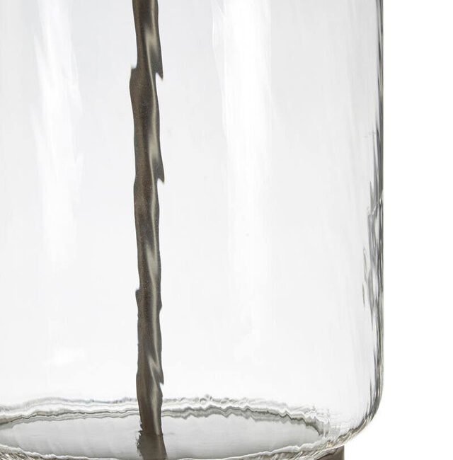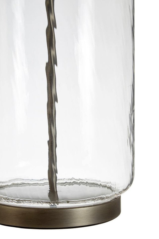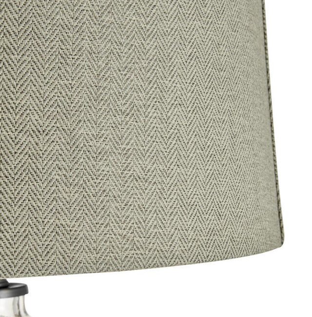 This table lamp has a contemporary glass and chrome design. The stepped design of the base and the rod being visible through the clear glass elevate elegance while a grey and black linen shade allows the lamp to easily blend in any decor.