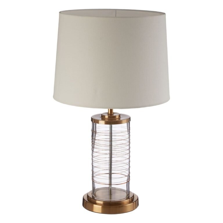 Uiella Table Lamp: Luxe design sensibilities dictate the elegant, yet contemporary, design of the Uiella table lamp. Rich gold finish wire wraps around the lamp’s clear glass cylindrical base adding a touch of understated luxury. The lamp’s white linen shade creates a textural contrast with the smooth metal and glass and brightens the design.