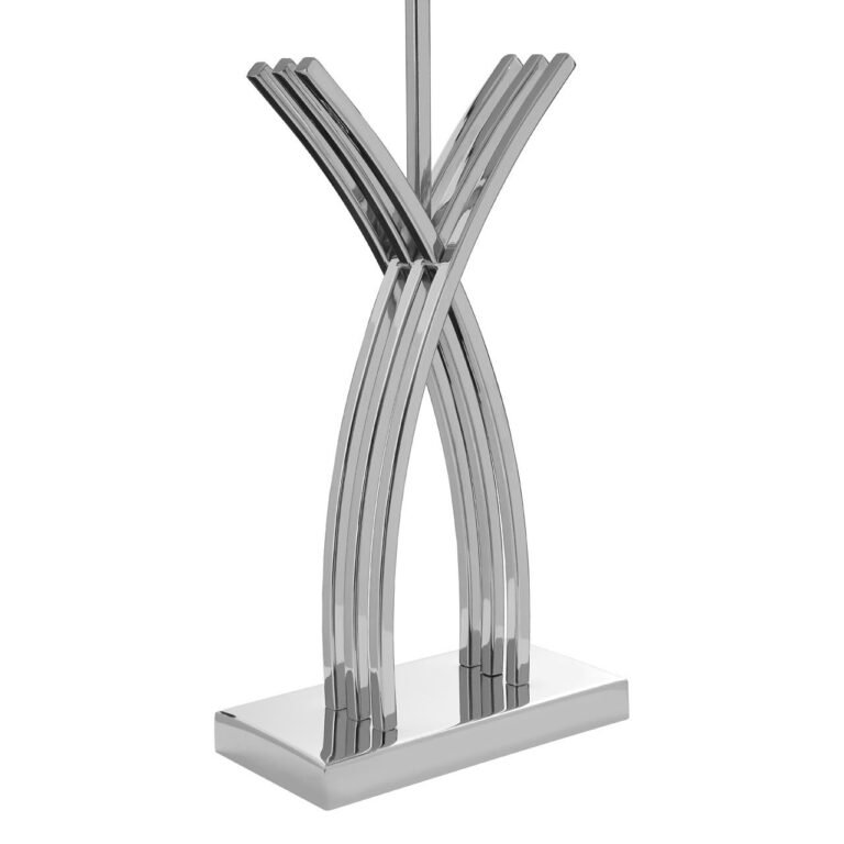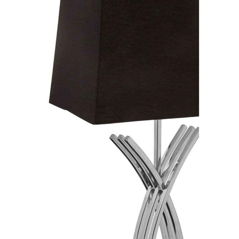 The base of the Verge Table Lamp is made from sleek tubular stainless steel. Two arcs intersect beneath a shade made from soft black fabric.