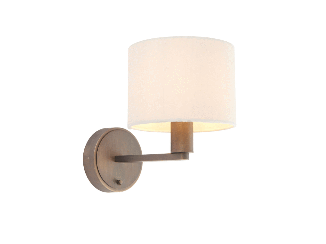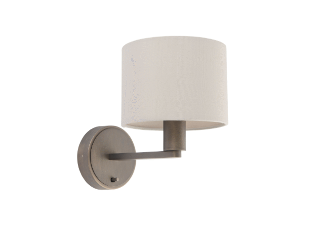 An understated interior wall light, mixing a subtle brushed plated finish with a timeless vintage white faux silk fabric shade. With modern on/off switch. Modern styling for today’s interiors. Matching items also available.