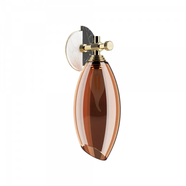 The Cocoon Sconce, inspired by the shapes of Art Deco jewels, brings elegance and character to any living area. This modern sconce is perfect for high-end interior design projects. Measuring 18 cm (7.1 in) in width, 22 cm (8.7 in) in depth, and 52 cm (20.5 in) in height, it features a structure in gold polished stainless steel, amber-colored glass, and details in polished Carrara marble and Nero Marquina. Elevate your space with the sophisticated and luxurious Cocoon Sconce.