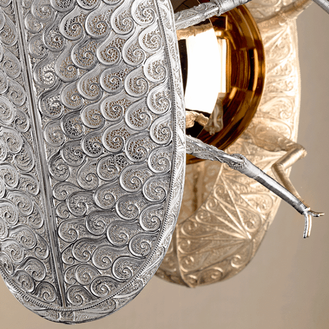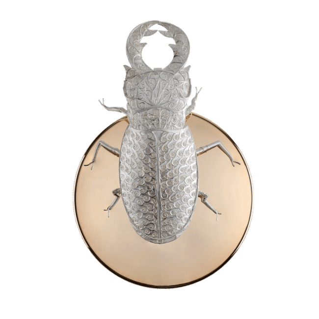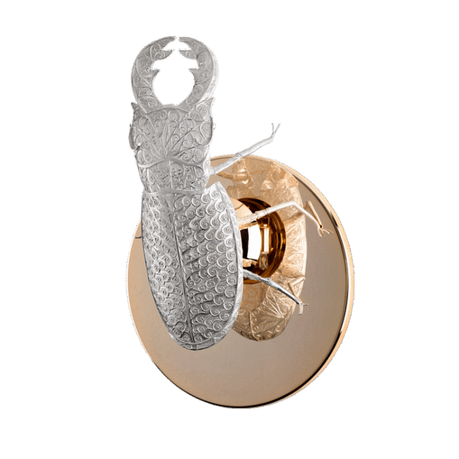 The Lucanus sconce brings a sophisticated symbiosis between a rare insect figure and the pure beauty of the silver filigree. The plate is made of polished brass and gold plated and completes this masterpiece.