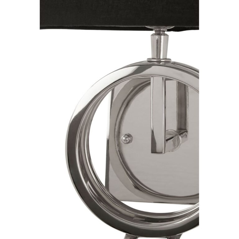 The Hartel Wall Lamp With Asymmetric Ring Base features two interlinked stainless steel hoops and a matching wall plate. The steel has a reflective nickel finish that contrasts with the tapered black fabric shade. Its sophisticated looks elevate the hallway or living room.