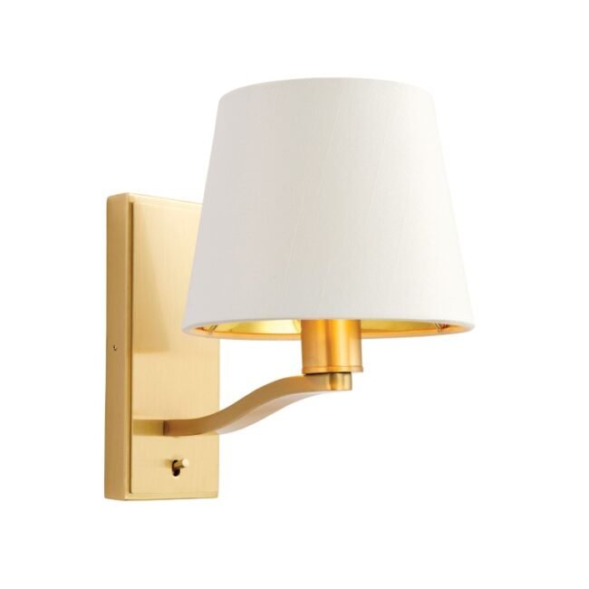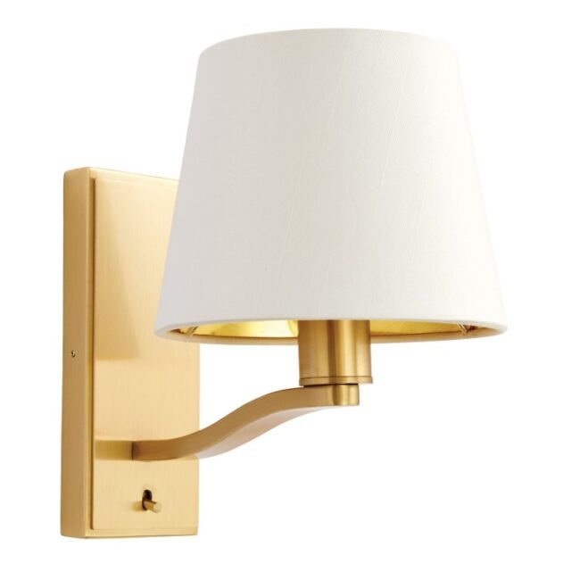 This wall light is finished in brushed satin gold plate, complemented by a vintage white, faux silk shade, with metallic gold inner, for the perfect sophisticated boutique hotel look. With modern on / off switch. Matching items also available.