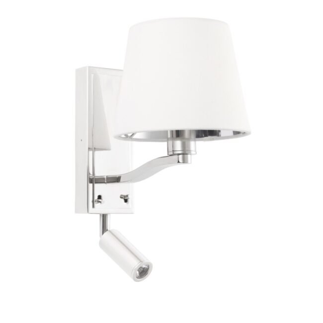This wall and reading light is finished in bright nickel plate complemented by a vintage white, faux silk shade, with a silver lined, vintage white, faux silk shade. Featuring an additional, adjustable LED reading light, for the perfect sophisticated boutique hotel look. Matching items also available.
