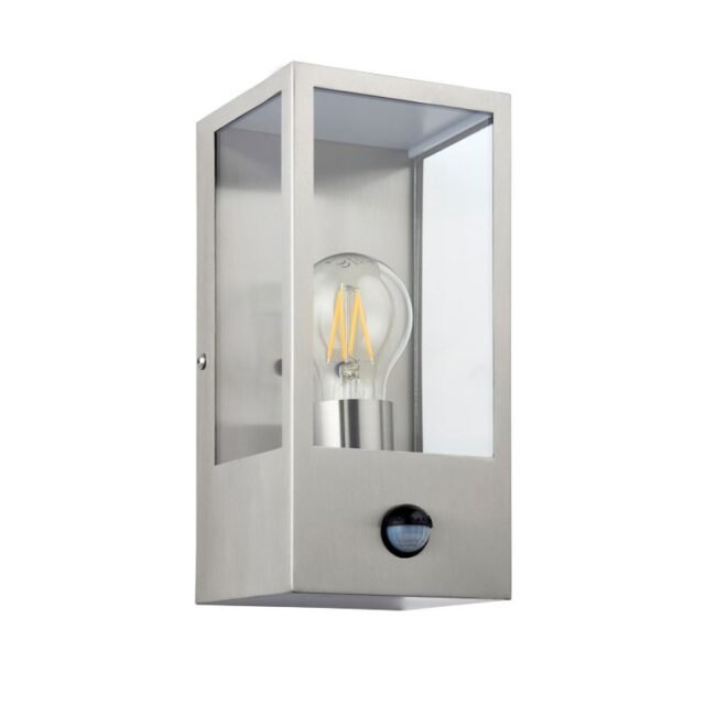 A timeless and classic style outdoor wall light, fashioned as a box lantern with sleek brushed stainless steel edges and bevelled edge glass panels. 10-2000 lux and 110‡ detection, this is IP44 rated for safe exterior use and perfectly pairs with E27 filament lamps. With built-in manual override for the functional motion sensor, with an adjustable 5 sec – 5 min timer function. The perfect addition to complement today’s exterior architecture.