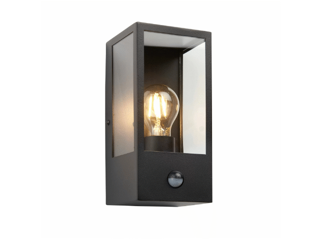 A timeless and classic style outdoor wall light, fashioned as a box lantern with sleek matt black painted stainless steel edges and bevelled edge glass panels. 10-2000 lux and 110‡ detection, this is IP44 rated for safe exterior use and perfectly pairs with E27 filament lamps. With built-in manual override for the functional motion sensor, with an adjustable 5 sec – 5 min timer function. The perfect addition to complement today’s exterior architecture.