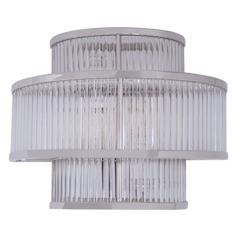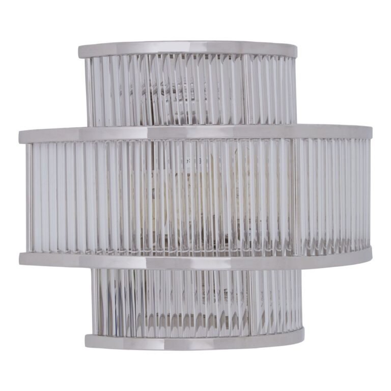 This Tarte 3 Tier Nickel Finish Glass Wall Light is a contemporary accent piece made with glass and iron. The delicate glass comes is carefully arrnged to form a fluted pattern within the semi-circular nickel frame, creating an ambiance of diffused light.