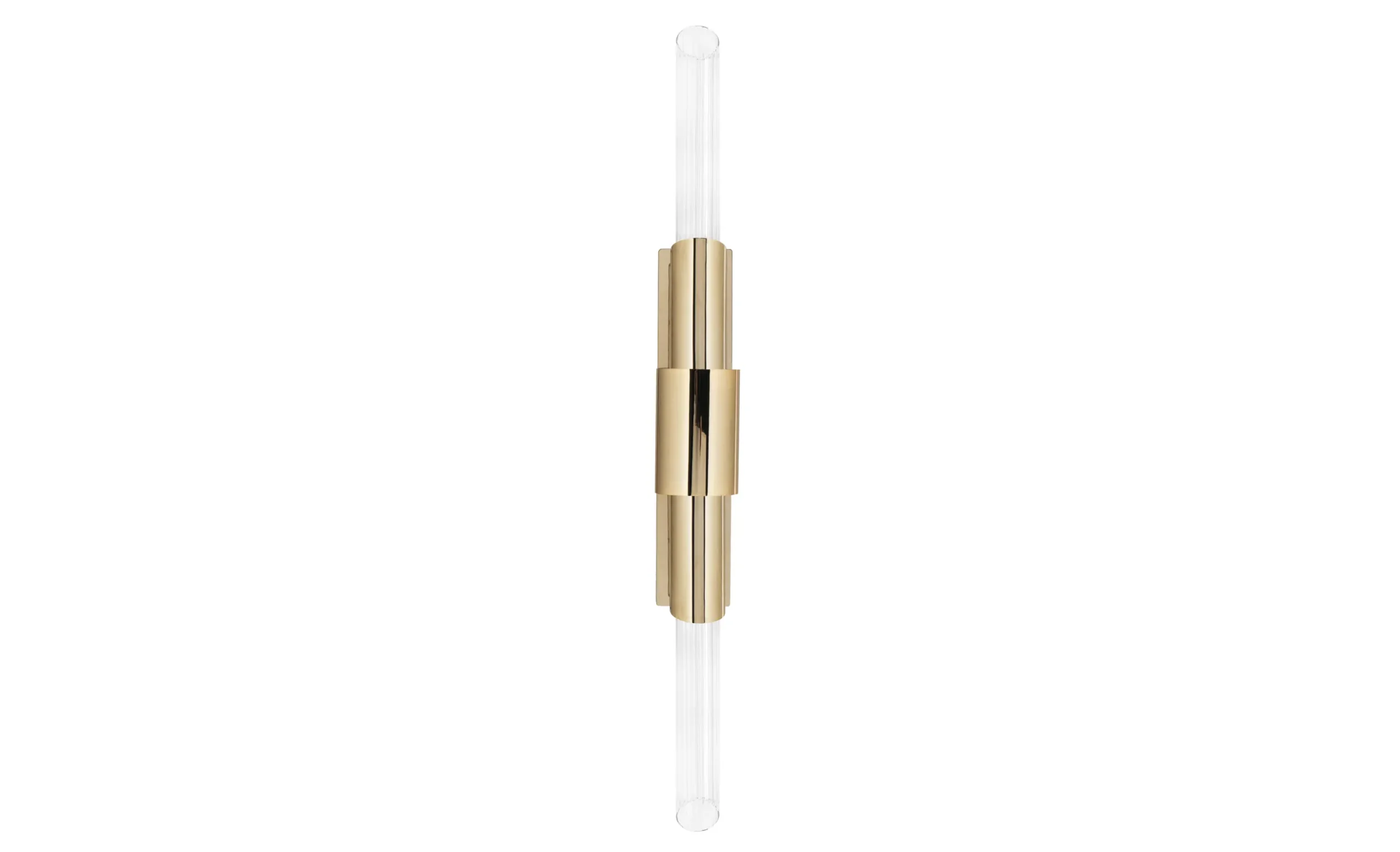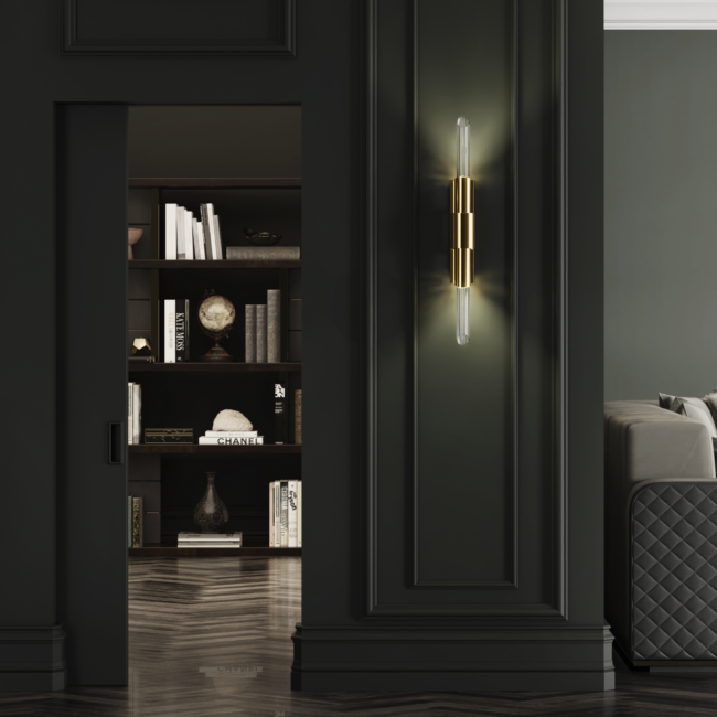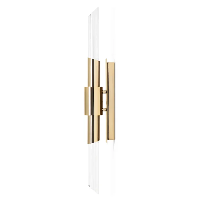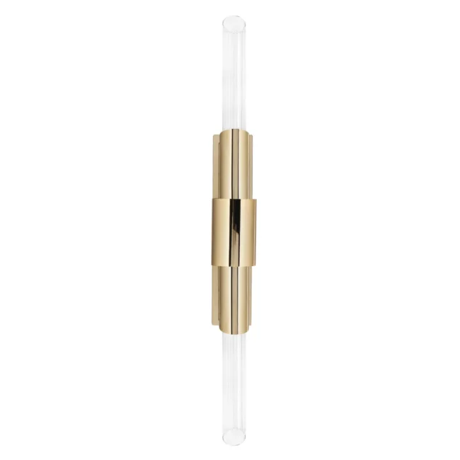 The Tycho Small XS Wall Lamp is a modern lighting fixture inspired by the phenomenon of reflection, providing intimate lighting that is perfect for a sophisticated environment. Its design features a single crystal tube encased in a ring of gold-plated brass, creating an elegant and stylish ambiance in modern interiors.