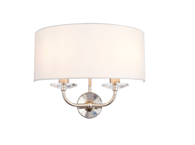 This twin light wall fitting is finished in a bright nickel plate. The arms are complimented with a touch of crystal and the fitting is topped with a vintage white, faux silk semi circular shade. Dimmable and suitable for use with LED lamps. Matching items available