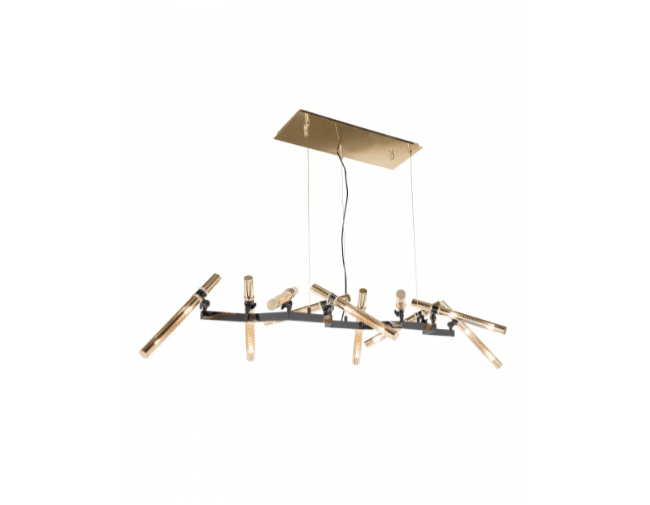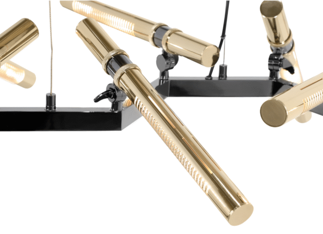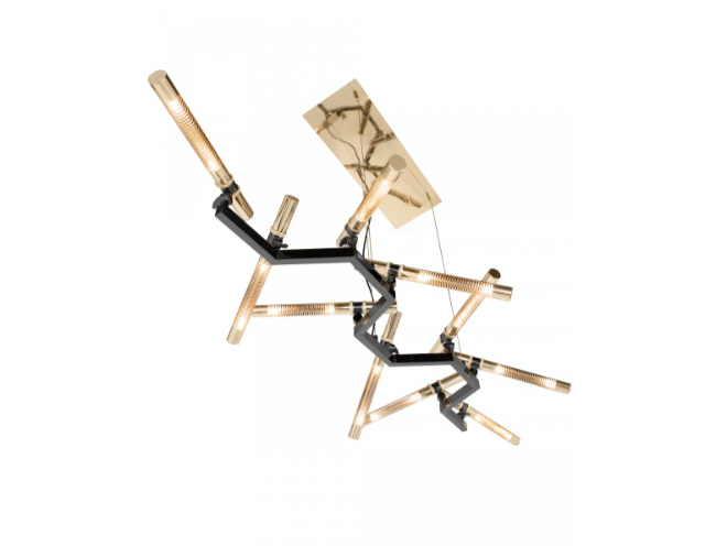 Falling in love with this stars-like piece, the Castro design team conceived this modern futuristic chandelier to be the center focal point in every wide room living area. Highlighting the natural shape of a group of stars forming this minimalistic but strong-will suspension. This handmade fixture is all made in brass with a mixture of black nickel and gold finishes. Zenith Suspension