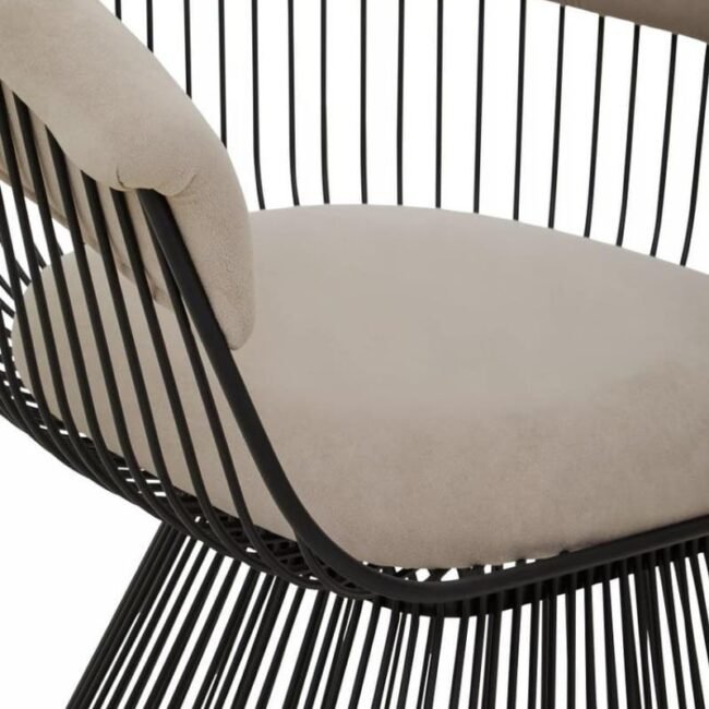 This elegant Aiste Mink and Black Velvet Chair has a luxurious art deco aesthetic. It has a curved back and sleek stainless steel frame in black finish.