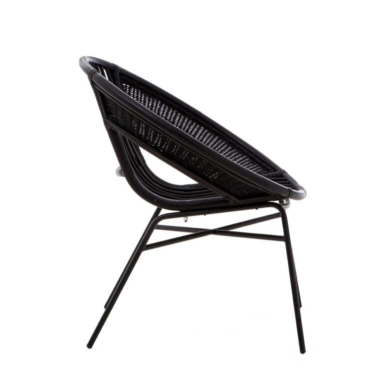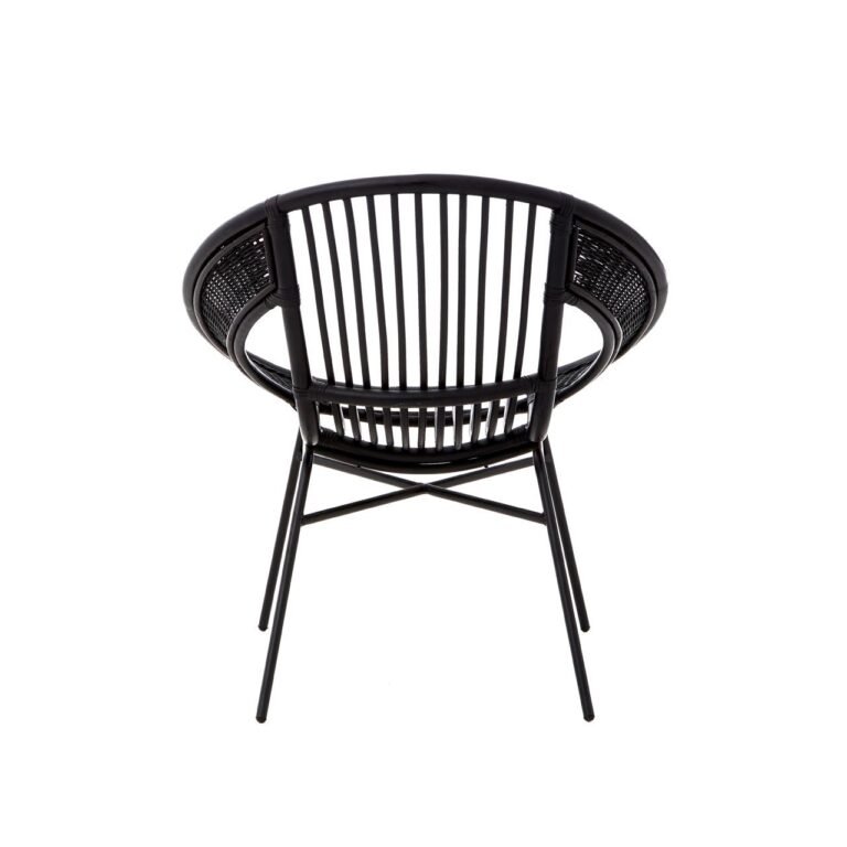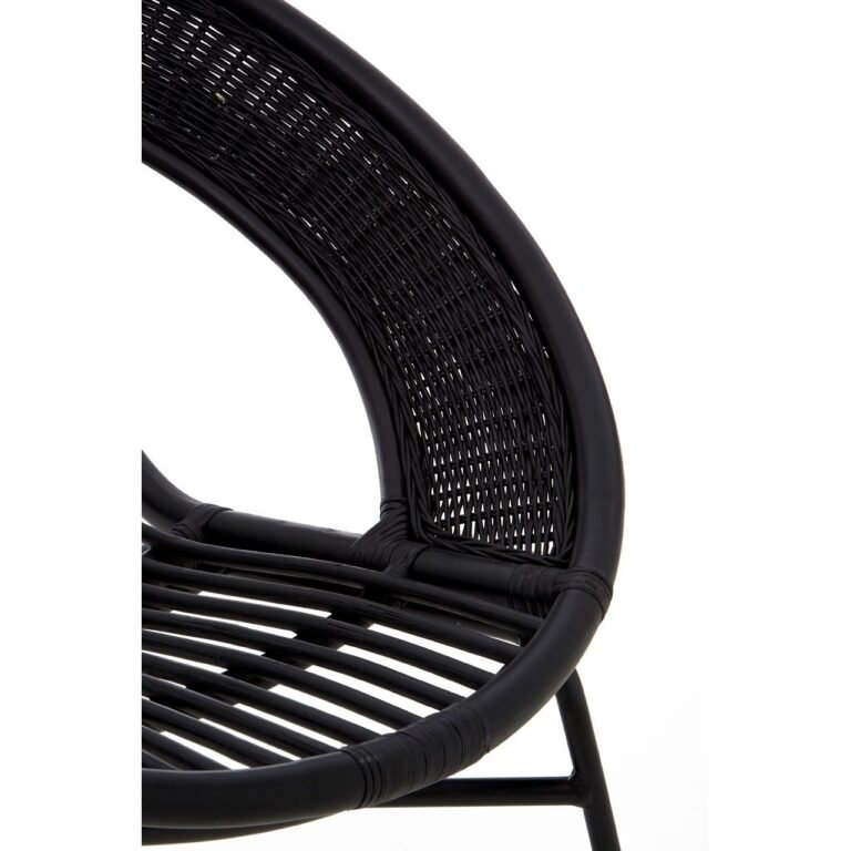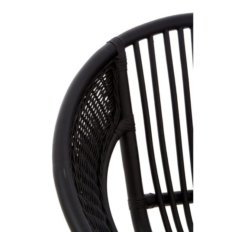 Albury Rattan / Iron Black Chair disc shaped seat is created from sustainable rattan, and has a jet black colour that tonally complements the black iron legs. This woven piece features tightly latticed side sections that offer a visual contrast to the spaced vertical lines that form its backrest. Thin strips of banding add further texture to its aesthetic.