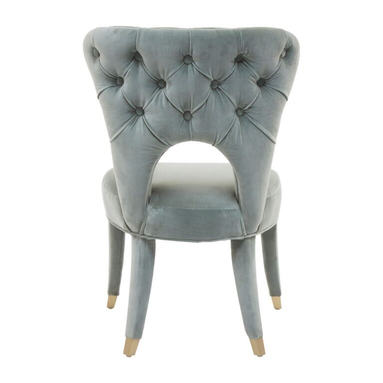 Alden Blue Feature Chair: Deep button tufting decorates the front and back of its arcing backrest. The backrest sweeps down to meet a thick padded seat, with gold finish metal tipping the feet of its curving legs. The frame is crafted from natural mahogany wood, and is upholstered with soft velvet from the top of its backrest to its legs.