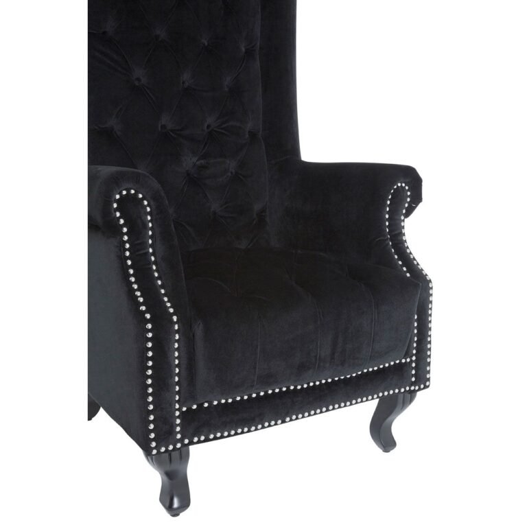 Argen Park Black Velvet Tall Porter Chair: This striking chair is upholstered in luxurious black velvet, soft and highly durable. Its tufted and buttoned seat, winged back and rolled arms all contribute to its classical look. Exquisitely carved hardwood legs further enhance the traditional feel, while silver studs introduce a metallic accent to its natural look. Use it to add drama to a hallway or living room corner space.