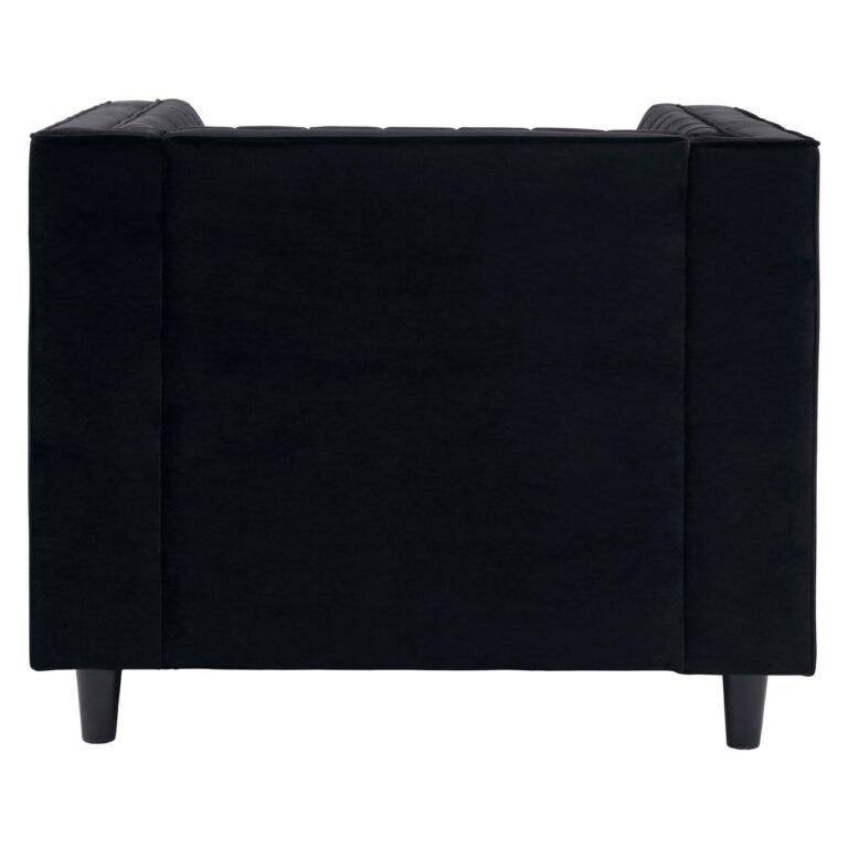 A contemporary design piece, the Arume Black Velvet Chair has a square, boxy appearance, with its backrest level with the armrests. Vertical channel tufting creates a pleat effect on the chair’s back and armrests, adding a subtle decorative detail. The chair is supported by four sustainable eucalyptus wood feet with a sleek black finish.