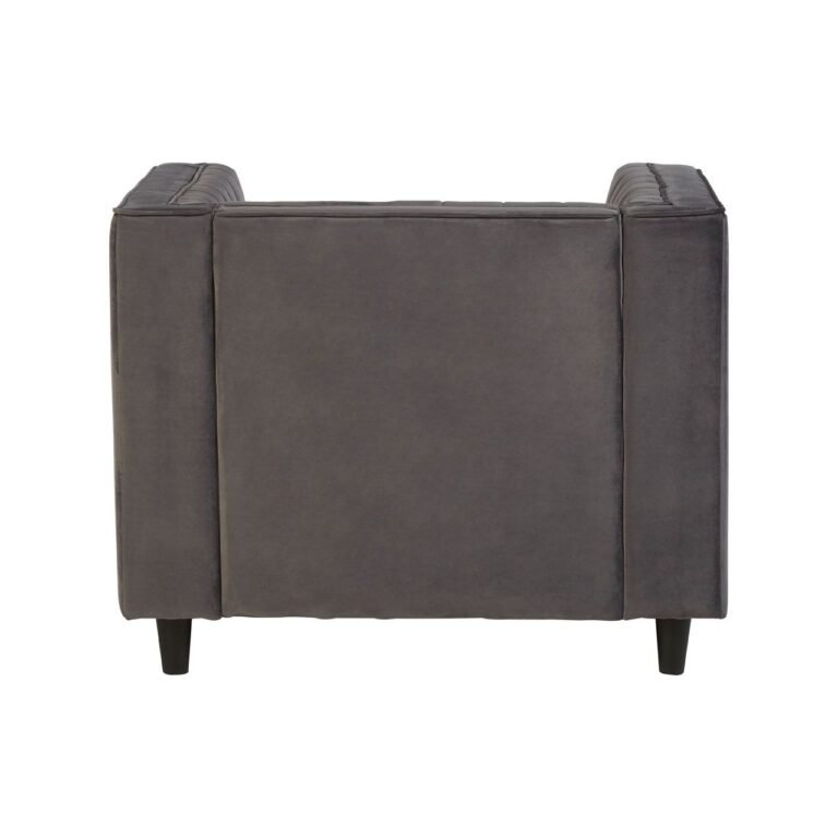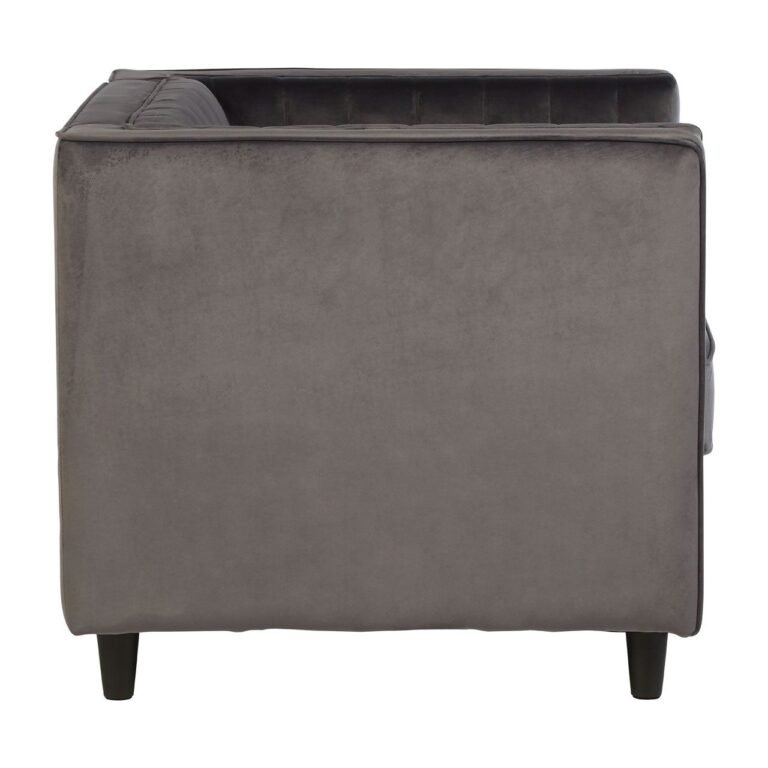 A contemporary design piece, the Arume Grey Velvet Chair has a square, boxy appearance, with its backrest level with the armrests. Vertical channel tufting creates a pleat effect on the chair’s back and armrests, adding a subtle decorative detail. The chair is supported by four sustainable eucalyptus wood feet with a sleek black finish.