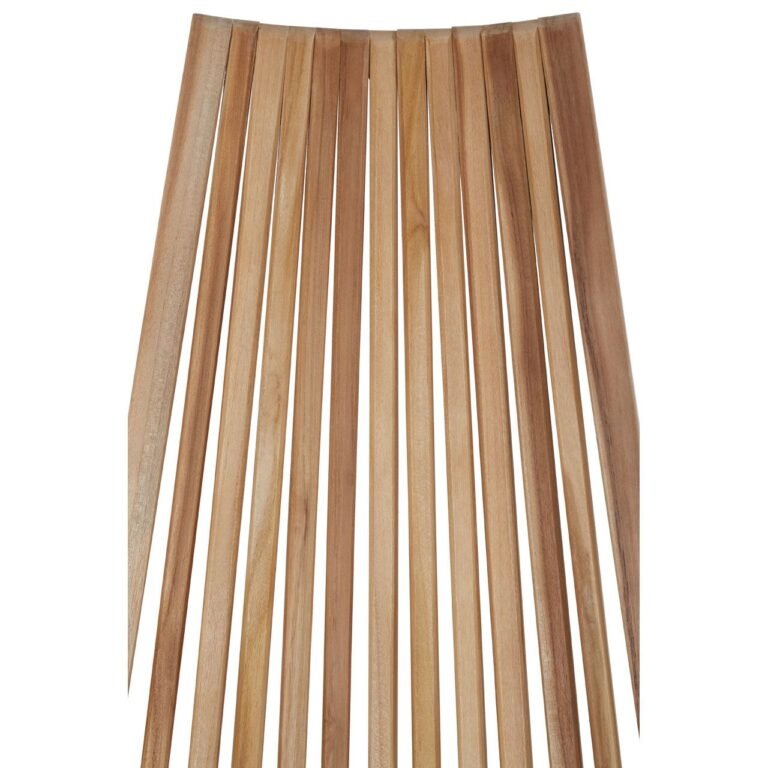 Ashburton Wooden Lounge Chair: Lengths of sustainable teak wood are used to create a striking statement chair. Its long back tapers to the top, while the seat rises at an angle. The wood has a natural finish that accentuates the subtle but distinctive grain pattern. With its pale colour and simple form, it makes a contemporary addition to scandi interiors.