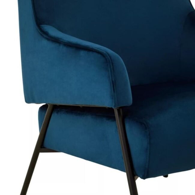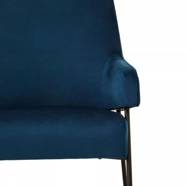Upholstered in plush blue velvet, this chair has a high back with a slightly tapered aesthetic. A small cutout opening intersects the padded seat and straight arms. The sleek black finish slanted legs enhance the visual appeal of the chair.