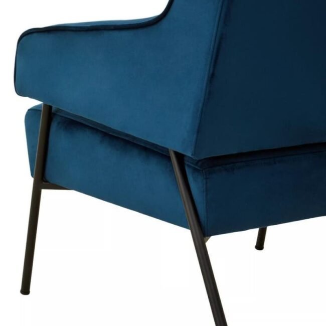 The Ashbury Blue Velvet Chair creates a retro aesthetic with its simple design featuring low arms and slanted legs.