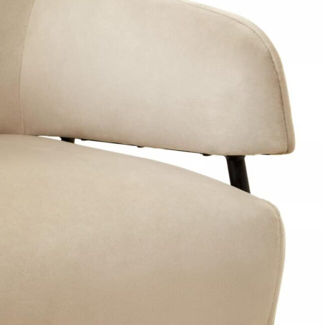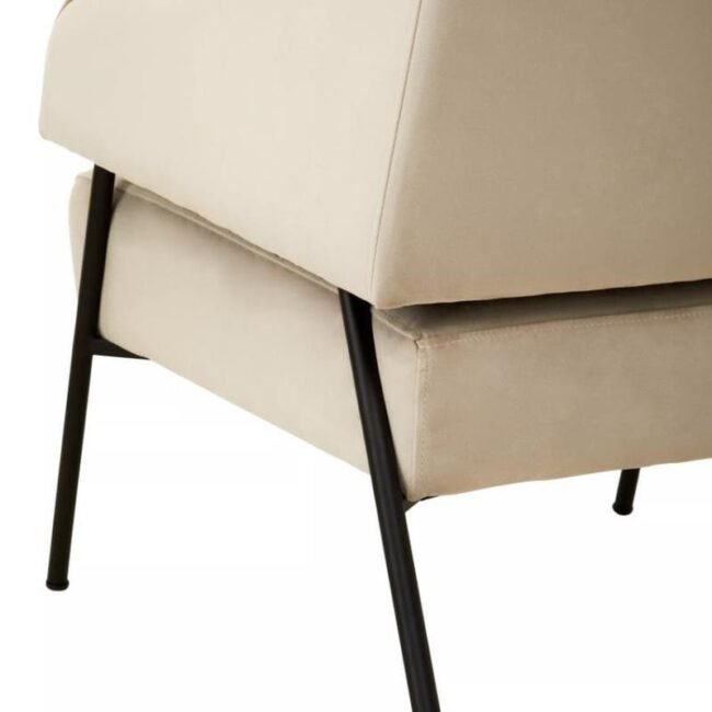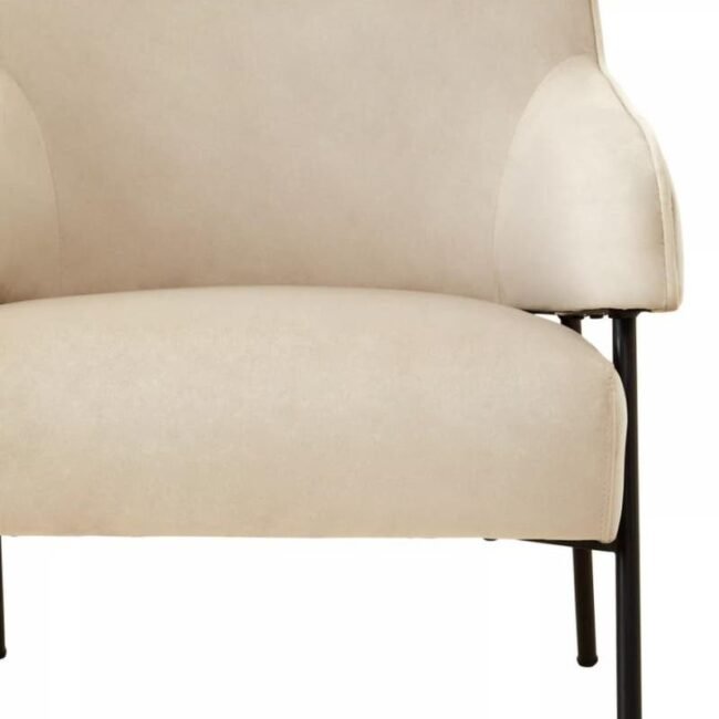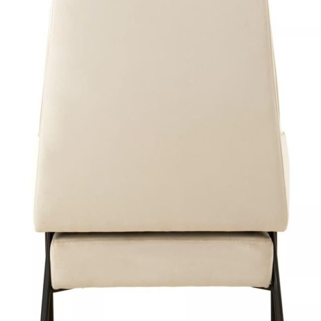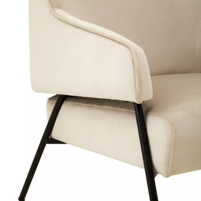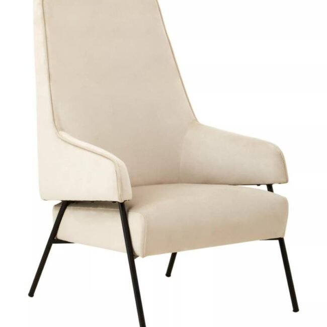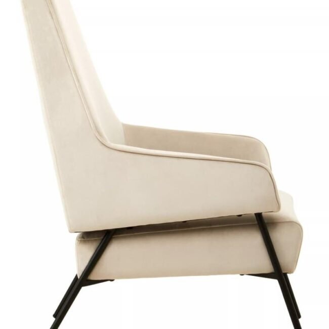 Upholstered in plush cream velvet, this chair has a high back with a slightly tapered aesthetic. A small cutout opening intersects the padded seat and straight arms. The sleek black finish slanted legs enhance the visual appeal of the chair.