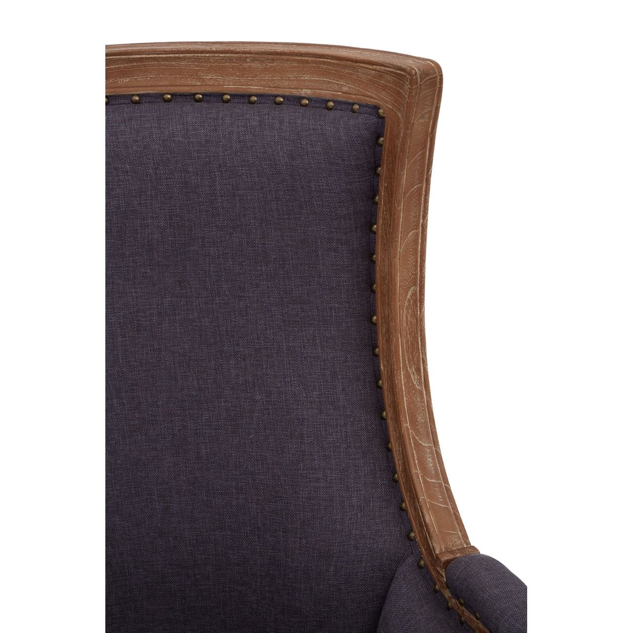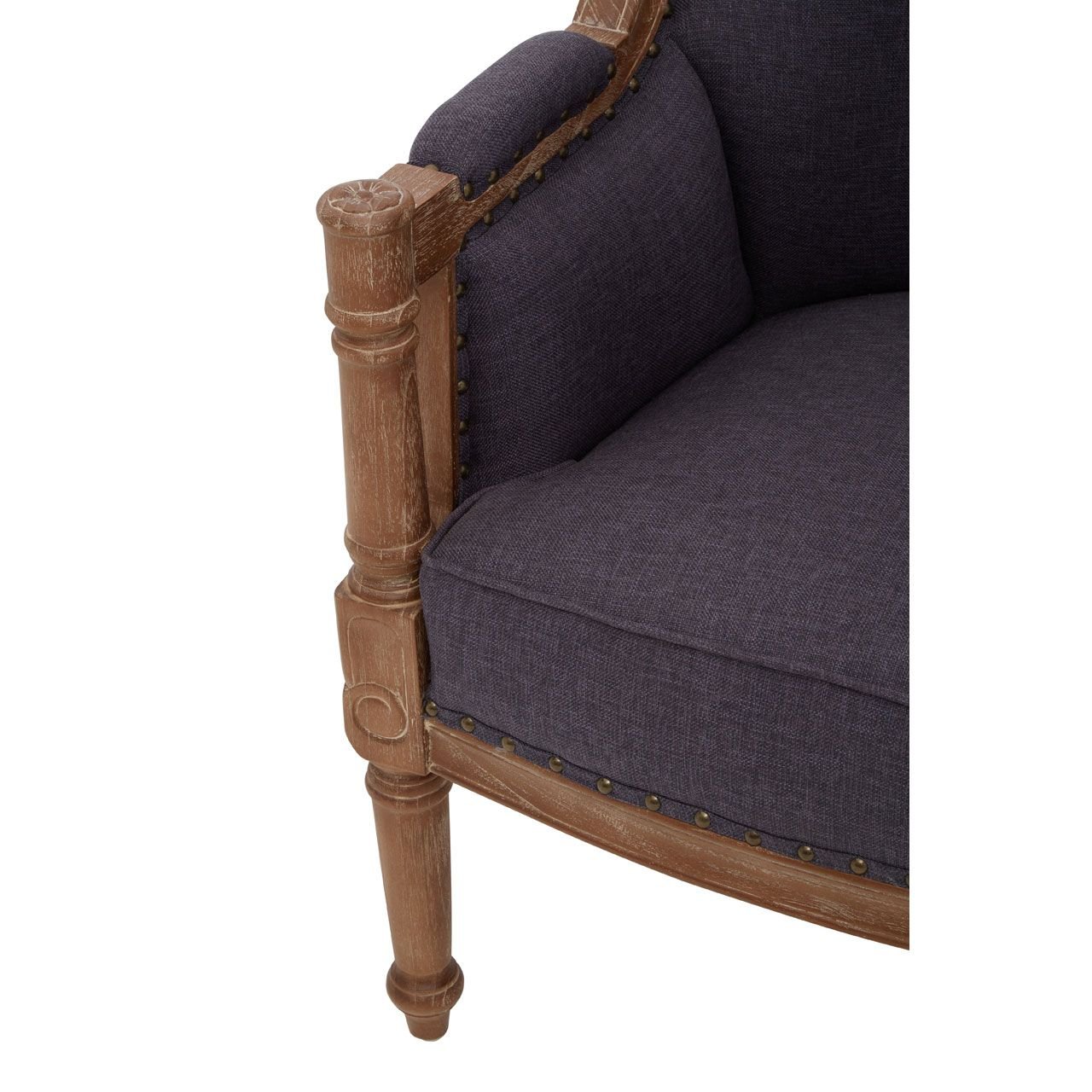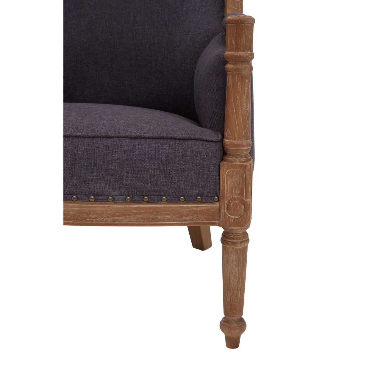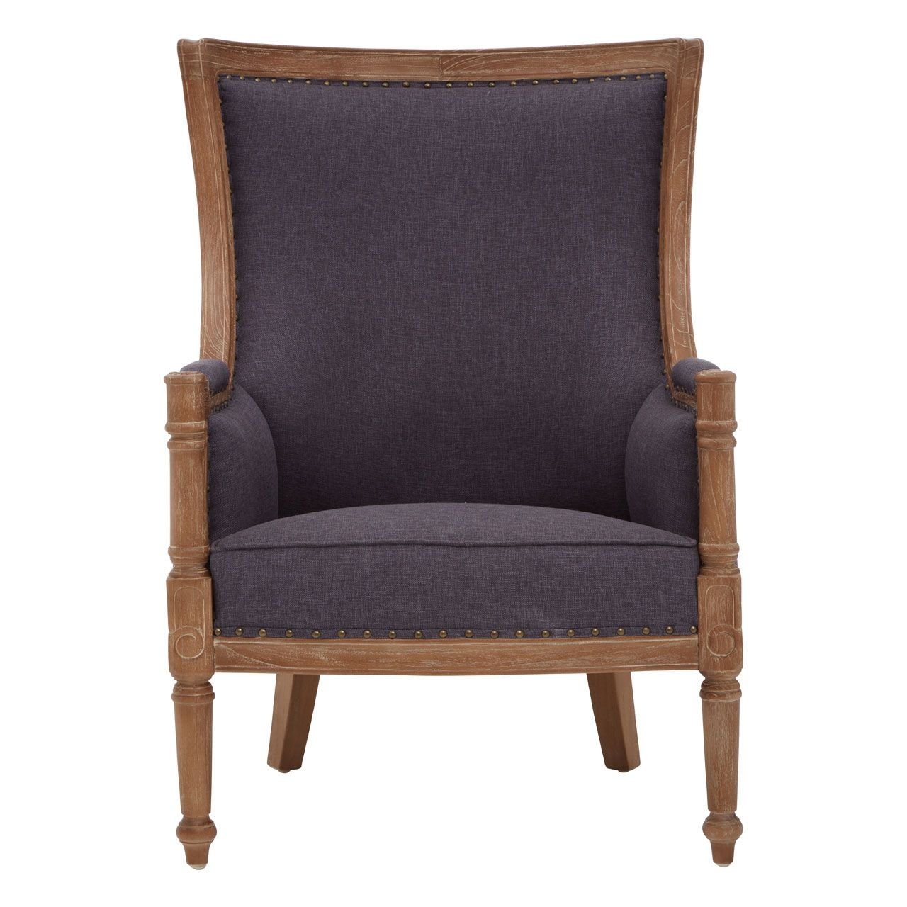 Made from mahogany wood, this accent chair has exposed back, sweeping armrests and intricately carved column legs. Graphite fabric neatly upholsters the distressed frame which is accentuated with the stud detail trim.