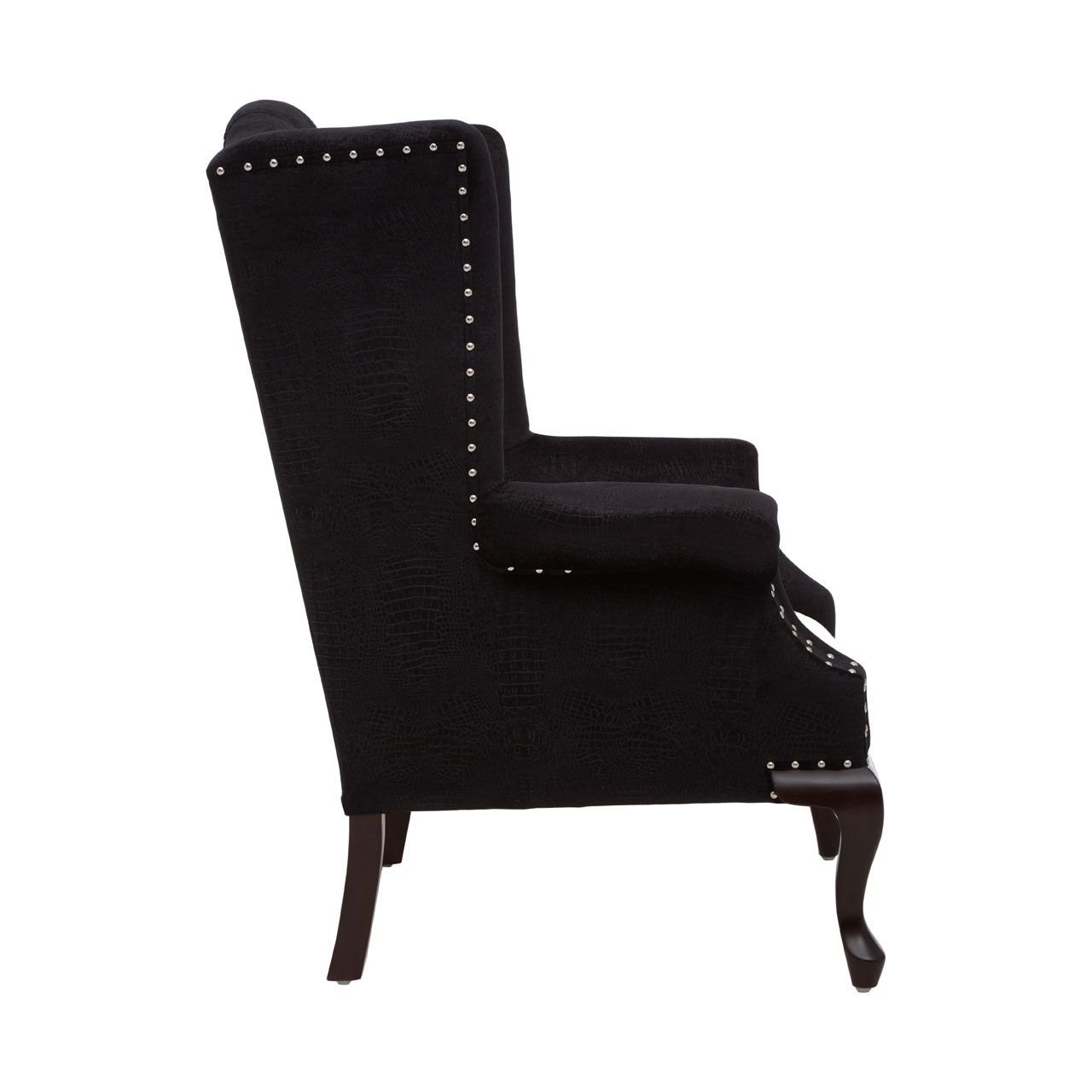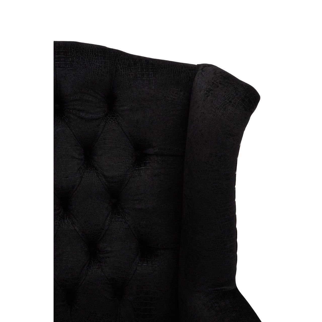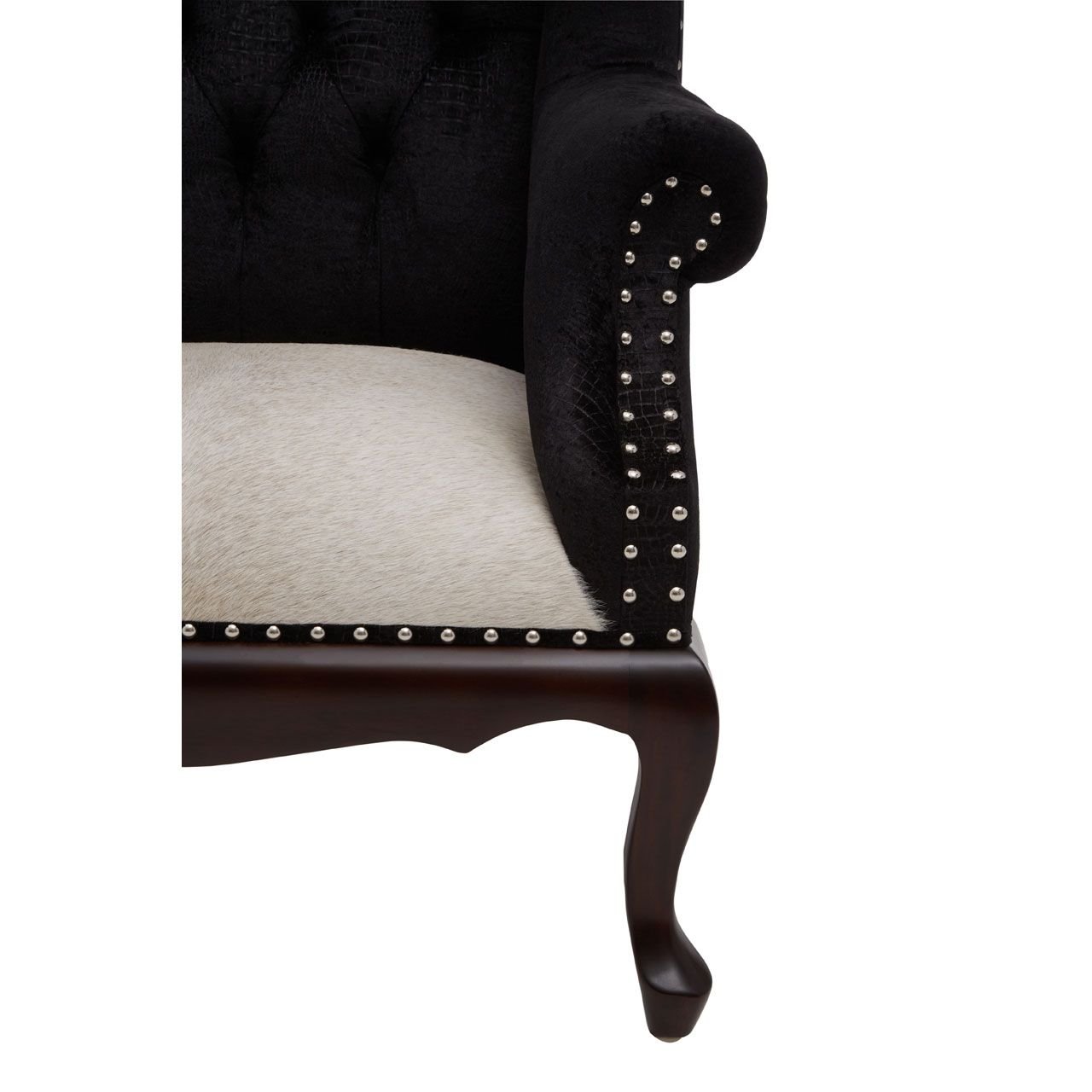 Upholstered in alligator fabric, this chair has deep button tufted winged back contrasted with seat in dense padding to create a monochrome look. The front border and scrolled arms are enhanced with luxe stud detail while carved mahogany wood legs further the classic inspiration.
