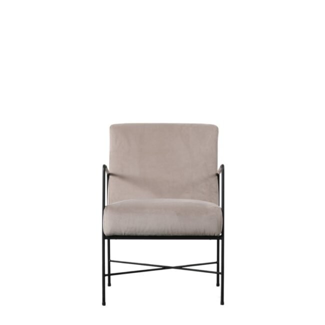 Contemporary armchair with a black metal frame which is paired with an upholstered seat and back. With the narrow metal arms featuring fabric wrapped detail, it is perfect for apartment living or other smaller spaces. The armchair is also available in grey.