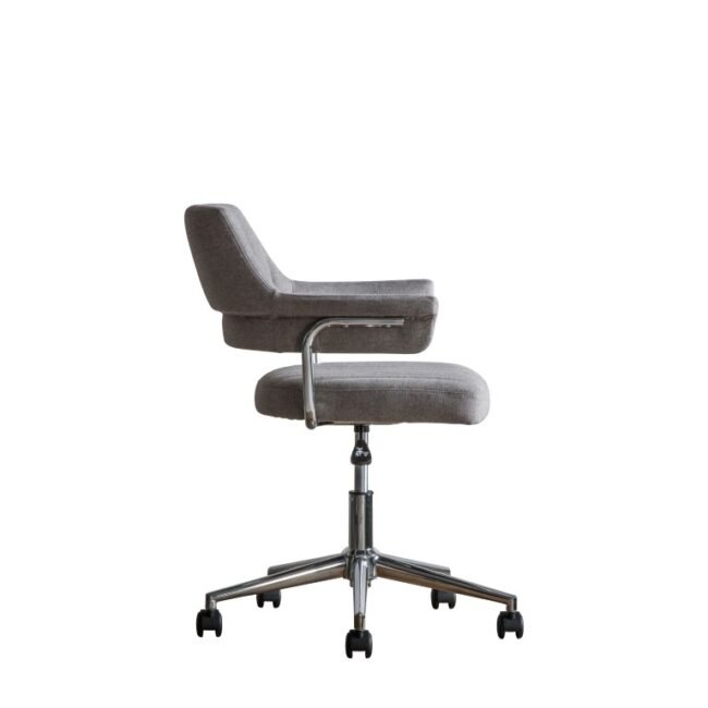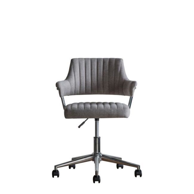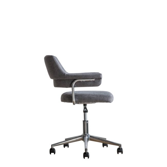 This swivel chair is ideal to add an unusual contemporary look to a home office. The padded seat and back are upholstered in a lovely grey fabric with stitch detailing, and for practicality, the chair is on castors for easy manoeuvrability and has gas lift seat height adjustment. Also available in charcoal grey fabric.