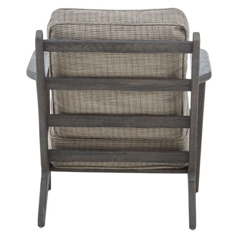 Crest Black Armchair: This chair uses black American oak to create a reclined frame with a slatted backrest. The frame features the striking grain that this type of oak is renowned for. Plump cushions cover the seat and backrest, each one upholstered with textured tweed.