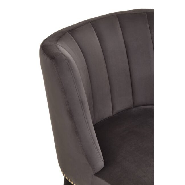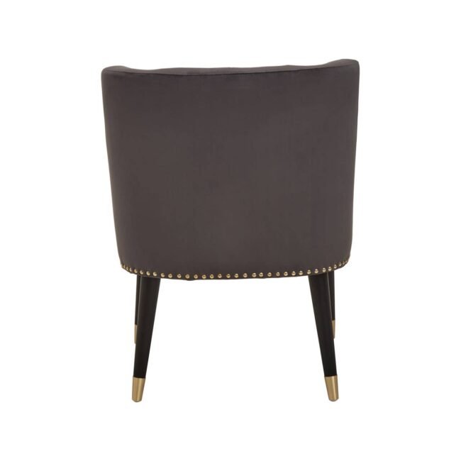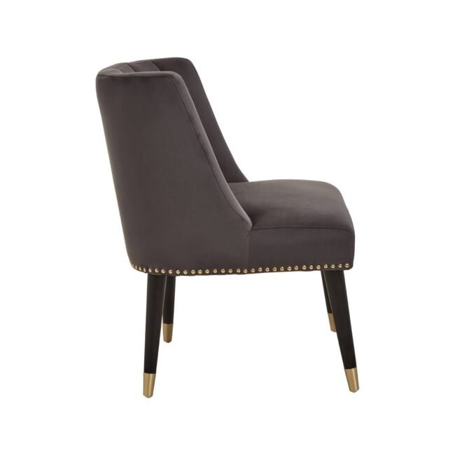 Covered in stone grey velvet, this chair with a thick foam padded seat is complemented by a curved back with vertical channel tufting. The black rubberwood angular legs with gold finish tips add hints of glamour to the midcentury modern design.
