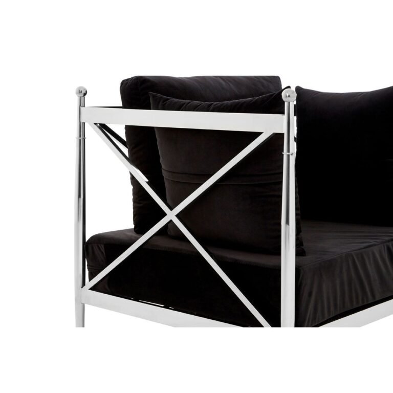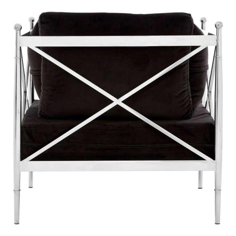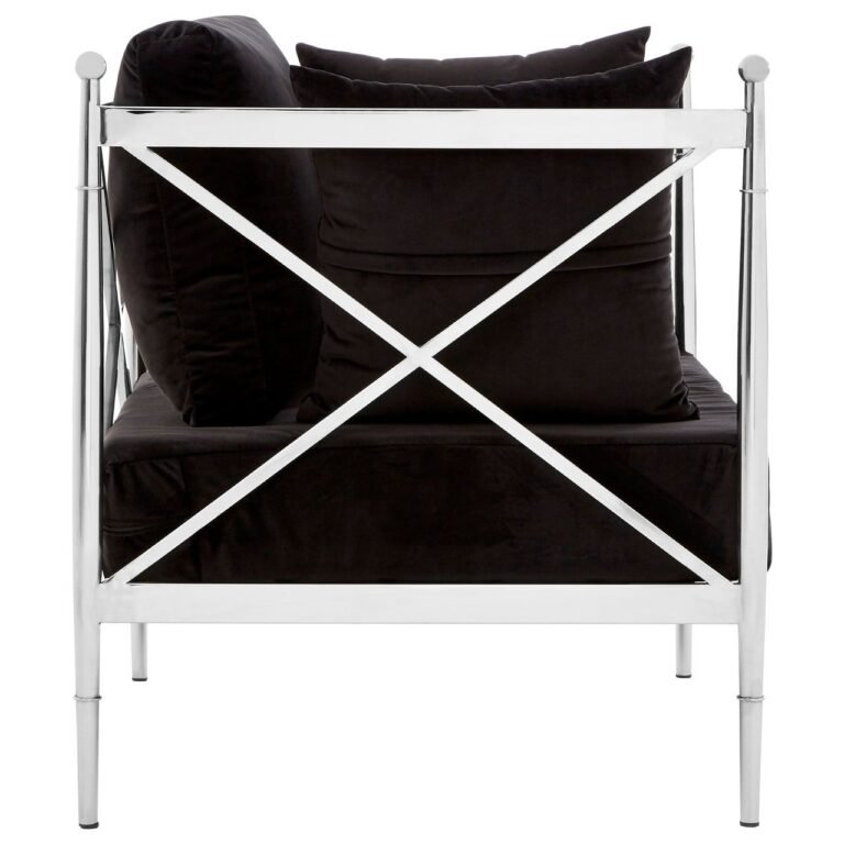 Eaia Chair With Silver Lattice Arms: Created from strong steel, the frame of the Eaia chair boasts a stylish silver finish, evoking a luxurious feel. The metallic body is counterpointed by the lush black velvet that upholsters the seat and three cushions, creating a soft textured finish. The Eaia chair is a distinctive design piece with a minimal, angular frame that is equal parts sophisticated and opulent.