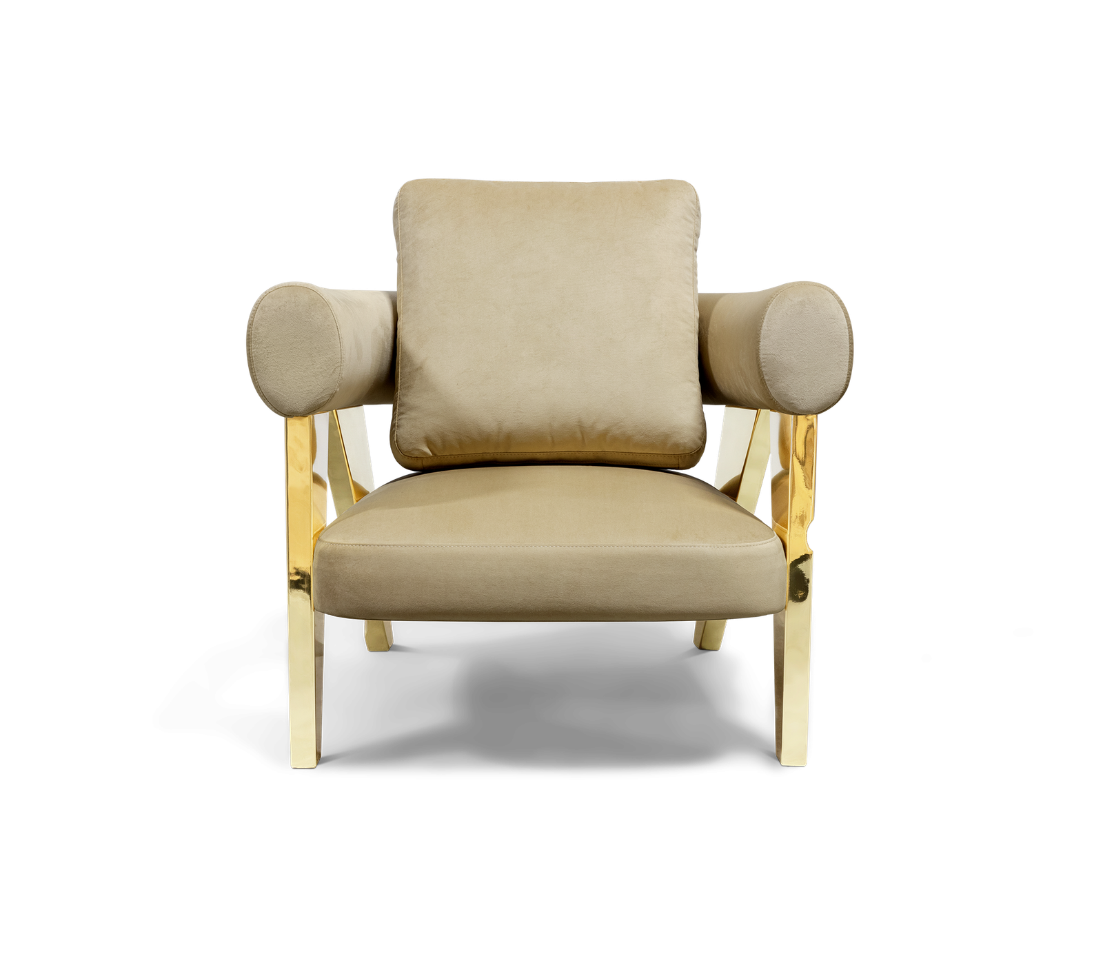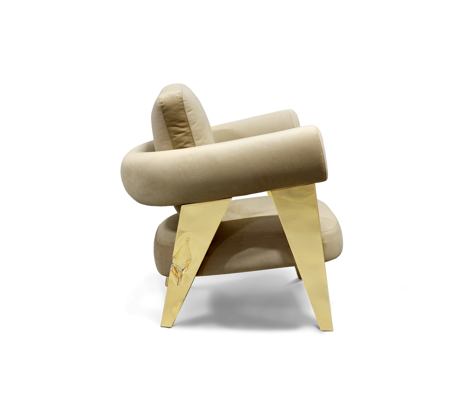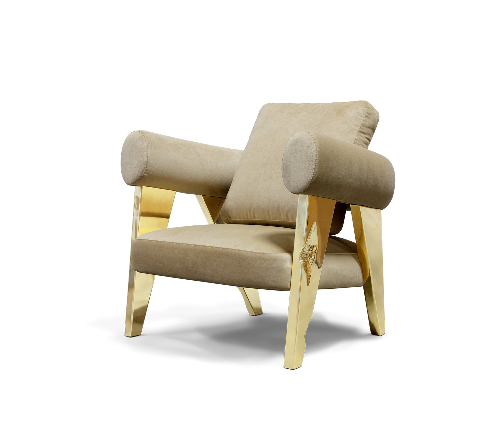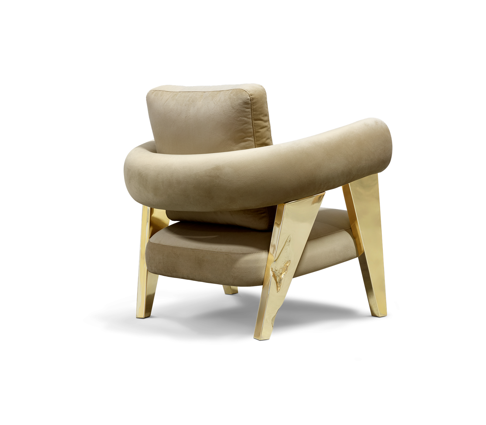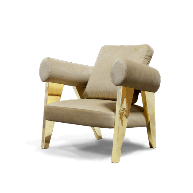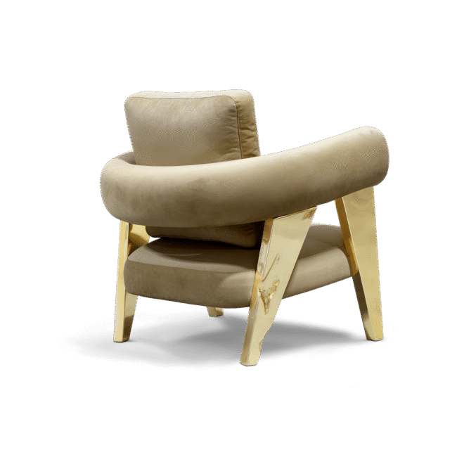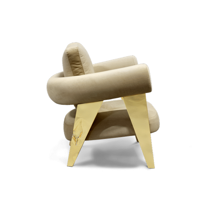 The armchair has polished brass legs with hammered brass details. The backrest is made of fabric in curve. The seat is also in fabric.
