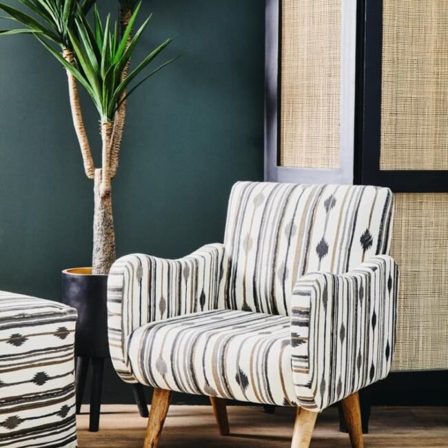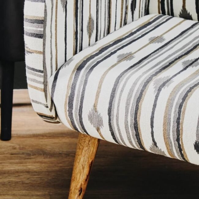 Featuring a deeply padded seat and curvaceous arms, this armchair is upholstered in black and white cotton. Crafted from sustainable mango wood, the pointed legs in natural warmth form an elegant contrast with the cotton weave.