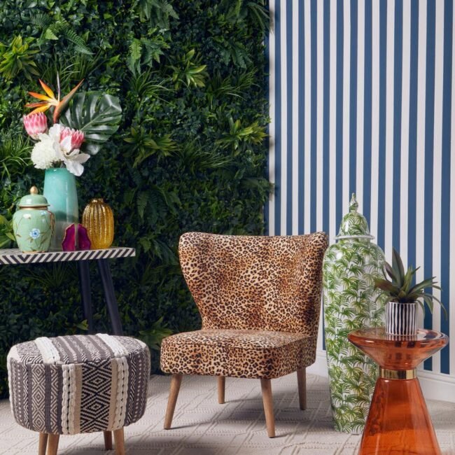 “Creating a contemporary statement is easy with the Fena Black Velvet Chair. The seat features a high back and is upholstered in luxurious leopard print velvet, which is complemented by sleek mango wood legs.”