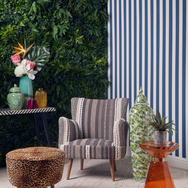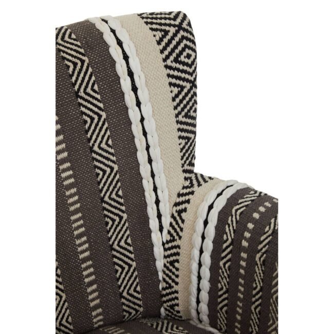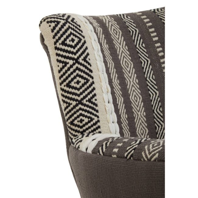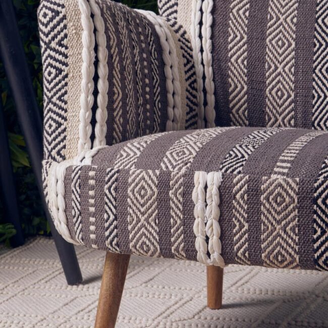 This chair has a plump seat and comfortable backrest supported by durable mango wood legs. The well stuffed seat has a grey and white fabric cover that make this chair a statement piece.