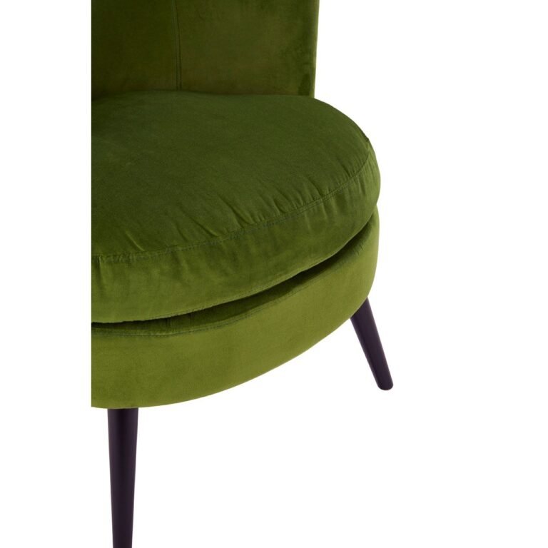 Greckle Green Round Armchair: Its backrest resolves in winged sides that complement the chair’s round seat front. The verdant green velvet upholstery is textured by the subtle stitching that accentuates the gently arcing backrest. The chair stands on legs made from eco-friendly birchwood, coloured black to offer a tonal counterpoint to the grey velvet.