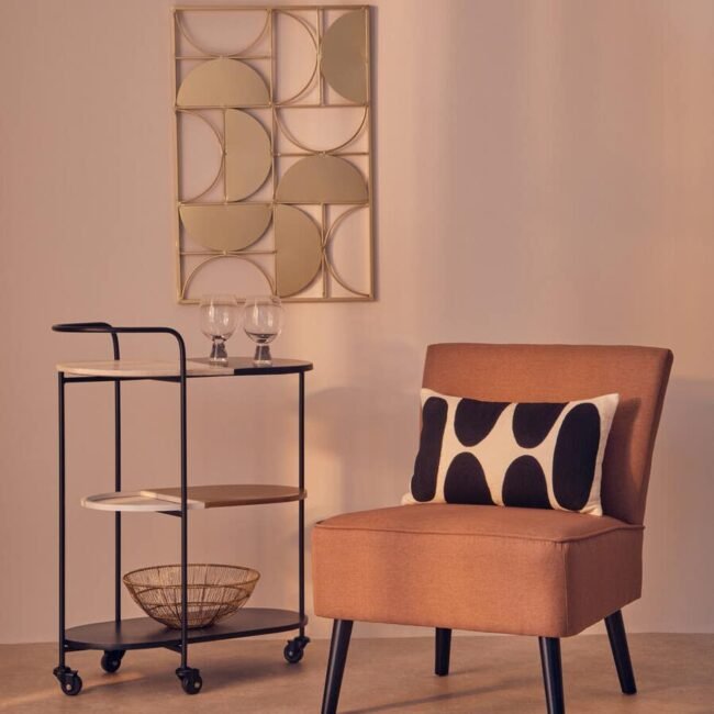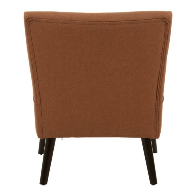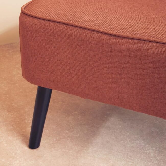 Upholstered in terracotta fabric, the Holm Terracotta Fabric Chair features a thick padded seat with a tapered backrest. Piped hem detailing outlines the seat and contributes to the chair?s clean aesthetic. Eco-friendly rubberwood legs are artistically angled and finished in black to counterpoint the tactile natural-toned upholstery.